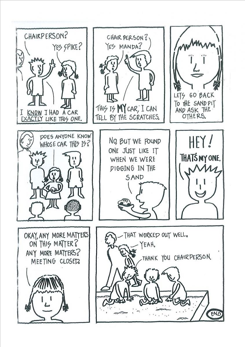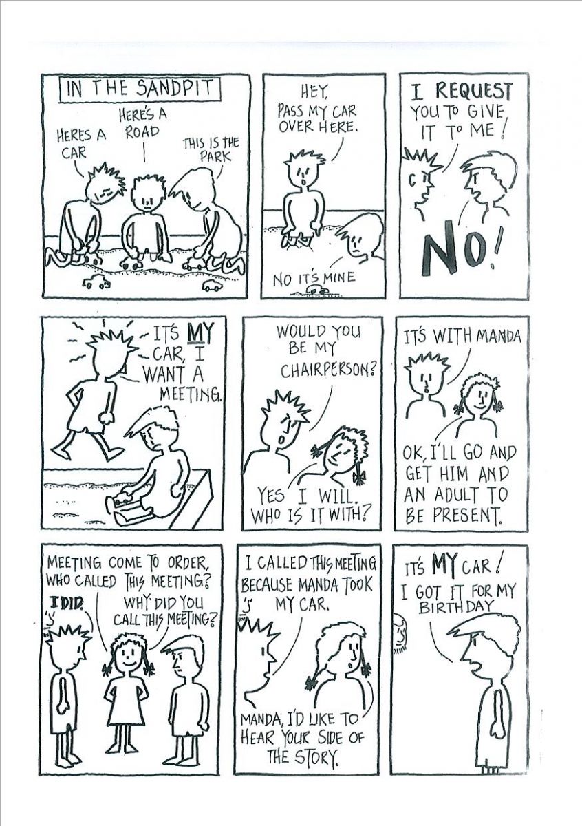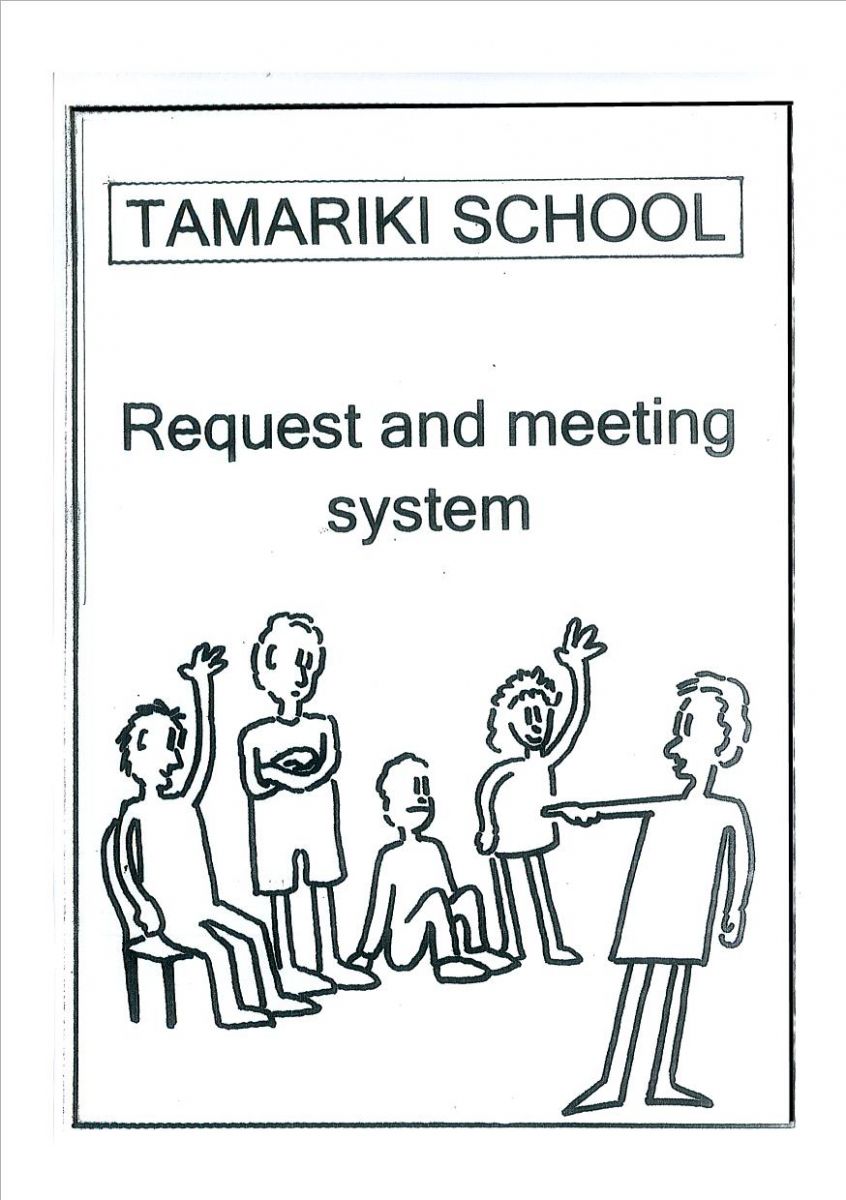 The Request and Meeting Systems go hand in hand. When a child or adult finds some behaviour annoying or against school rules, they may request that the person stops that behaviour. For example, by saying ‘I request that you stop calling me that name’. If the behaviour does not stop or alter after a second request, the initiator is encouraged to call a meeting to address the behaviour of the person.