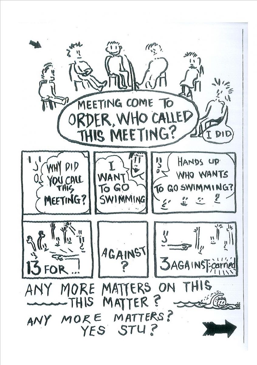 - Discussion is held, with people raising their hand and waiting for the chairperson to select them before they speak. Motions may be put forward for voting on.